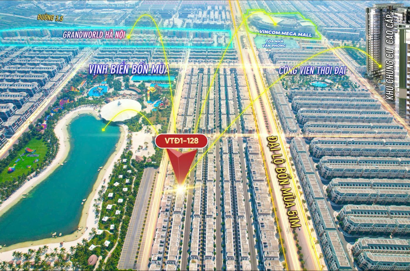 Nơi đây tiếp giáp Đại lộ Bốn Mùa rộng 51m, đồng thời nằm gần hồ nước nhân tạo Tropical Paradise – mang đến không gian sống trong lành, tầm nhìn thoáng đãng và tiềm năng gia tăng giá trị vượt trội.